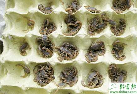 2。互相残杀死亡。当饲养期缺食品、缺水、单调、密渡过大时,会产生互相残杀景象。应留意投足食料,维持恰当水分,气候单调时留意喷水,增长空气湿度,密渡过大时分群饲养,就能够避免互相残杀景象的发生。3。高温死亡。气温达41℃以上,对生长不利,43℃很快死亡。如达40℃时,立刻开窗通气,洒水降温等办法,如室外饲养,蝎池要遮阳洒水,即可避免高温致死景象。4。强烈气胨刺激死亡。蝎子害怕强烈的味道刺激,如油漆、汽油、沥青、农药,化肥、生石灰及化学药品等。应避免有强烈味道的物品接近蝎室(池)邻近。5。母蛔残食仔蛔死亡。其起因:一是生下来爬不上母蝎背的弱仔蝎,会被母蝎吃掉;二是产后饥饿的母蝎有时会吃仔蝎。只需投足料,并在仔蝎下母背后,及时捉走母蝎,即可避免。6。雌蝎交配过多会病倒死亡。这种景象是个别的,不是传染病,可不必介意。7。敌害死亡。蝎有很多敌害,如:鼠、蚊、蛇、鸡等,注童预防即可。8。发病死亡。环境恶劣或管理不好,蝎子会发病死亡。蝎子的病害有真苗性病害和生理性病害两种。发病起因多属管理不当引起。只需仔细做好饲养管理工作,通常可预防病害发生。9。冬眠后春寒死亡。此种景象多勾弱蝎,主要是冬眠前贮存营养不足,或是雄蝎交配后体力未恢复就进冬眠者。冬眠前投足饲料,春寒时加强管理就可避免。