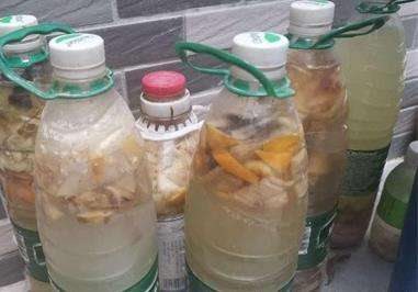 果皮水混合好后,要将塑料桶的桶盖盖严,进行无氧发酵,发酵前期每天开盖通风换气,防止炸瓶,换气后再拧上瓶盖,晃一晃塑料桶继续发酵,如果担心某天旺季开瓶放气,可以把瓶盖拧下来,在瓶孔罩上一个气球,等气球充满气体变大后进行放气。